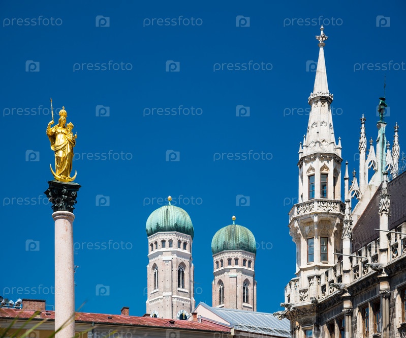 Золотая статуя Девы Марии и башня в центре Мюнхена