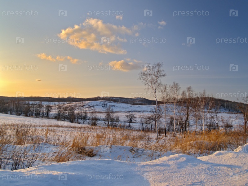 Зимний пейзаж на холмами, покрытыми снегом
