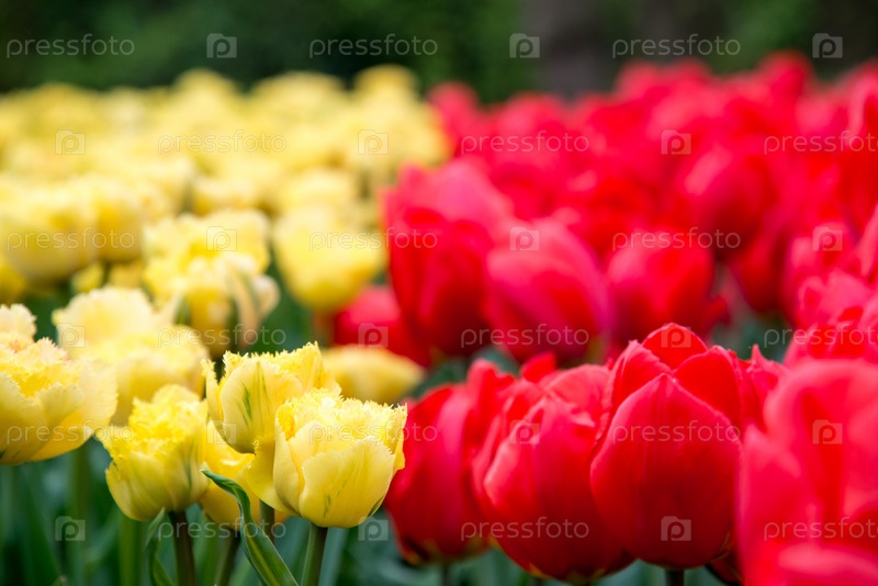 Красные и желтые тюльпаны в саду