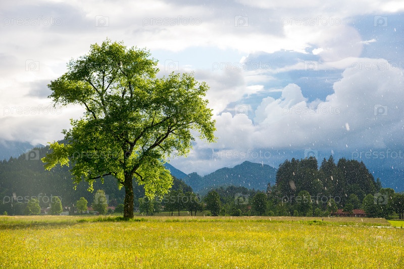 Дерево под дождем в солнечном свете