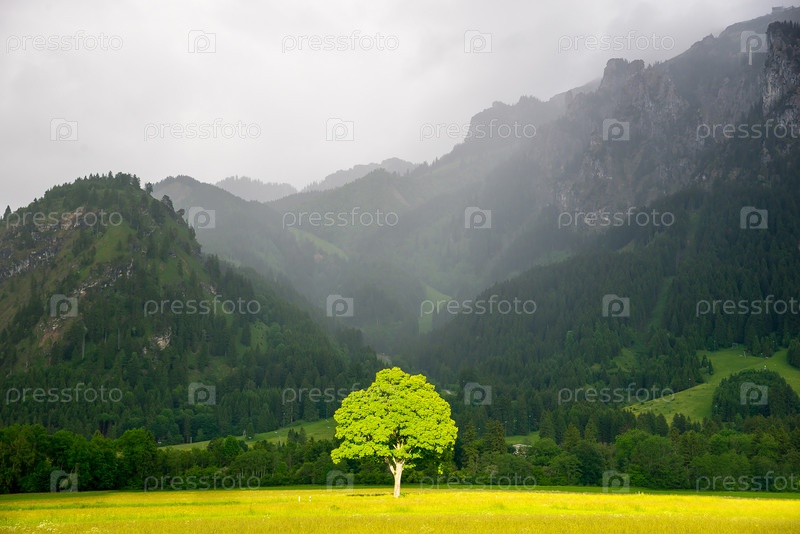 Одинокое дерево в солнечном свете. Альпы в тумане