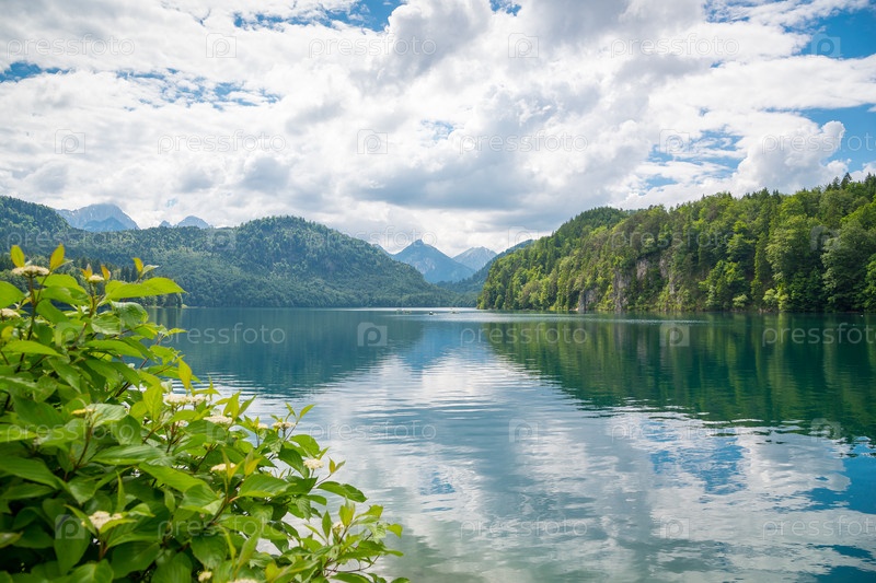 Озеро Альпзее в зеленом лесу и Альпы. Фюссен, Бавария, Германия