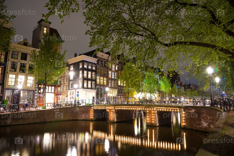 Один из известных каналов Амстердама, Нидерланды в сумерках