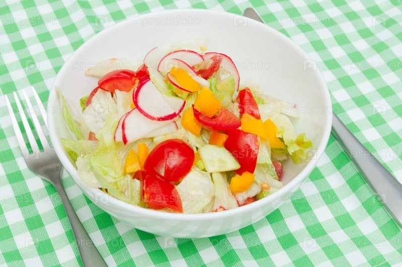 Свежий овощной салат из помидор, перца и редиса