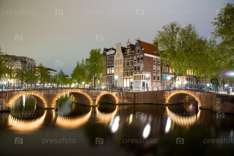 Один из известных каналов Амстердама, Нидерланды в сумерках