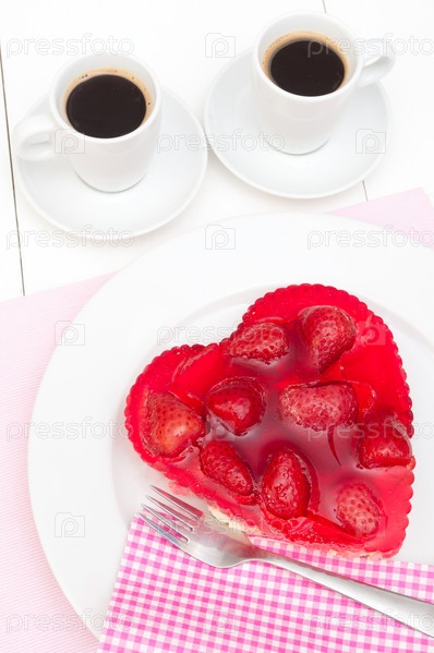 Клубничный пирог в форме сердца и две чашки кофе