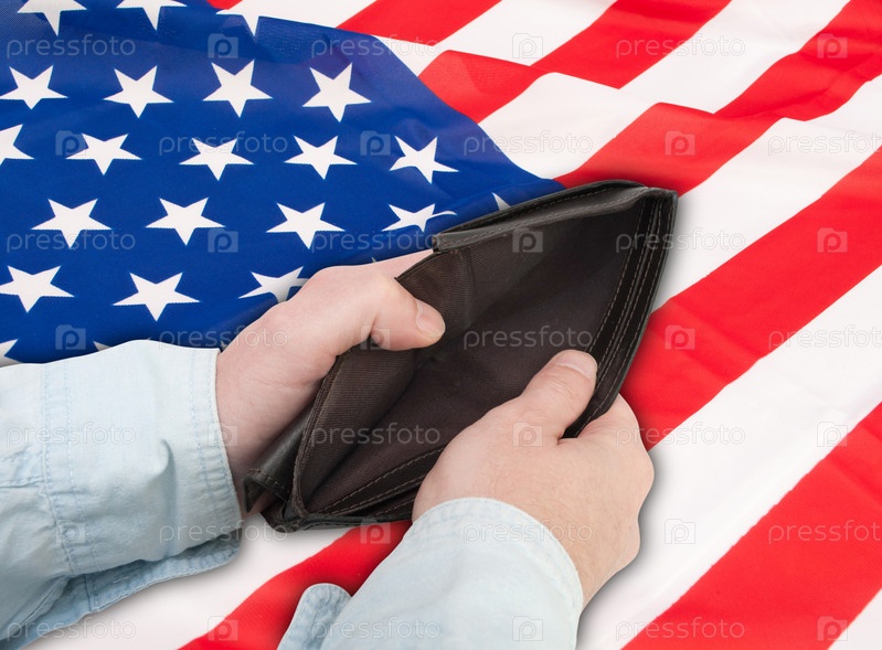 Финансовый кризис в Соединенных Штатах Америки. Мужские руки с пустым бумажником на фоне флага США