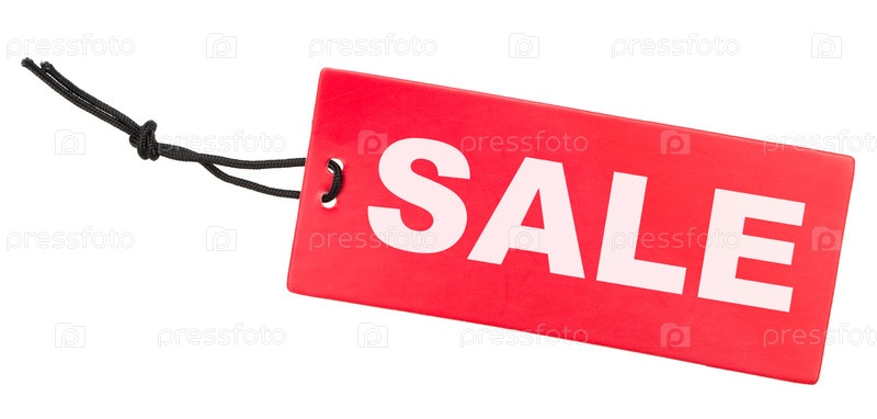 Красная бирка РАСПРОДАЖА крупным планом на белом фоне