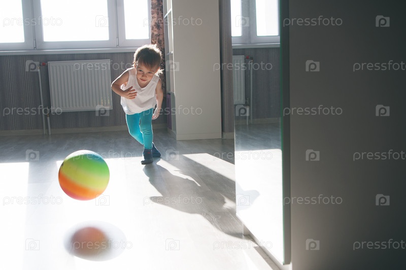 Ребенок играет с разноцветным мячом в квартире