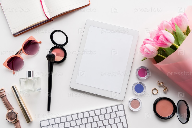 Женские аксессуары и букет розовых тюльпанов