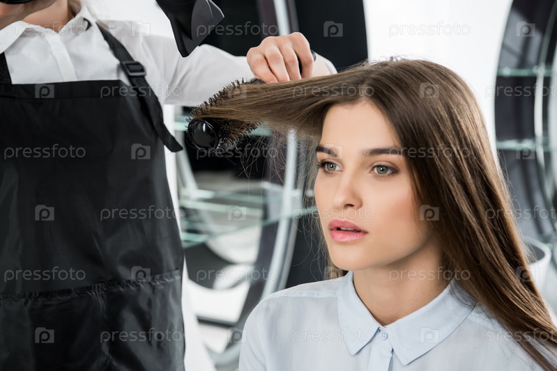 Сушка волос молодой привлекательной женщины в салоне красоты
