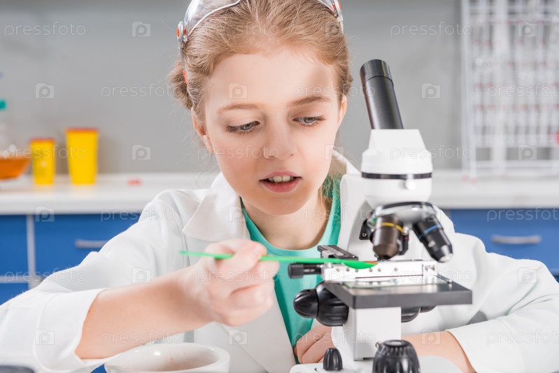 Маленькая девочка в очках с микроскопом в лаборатории