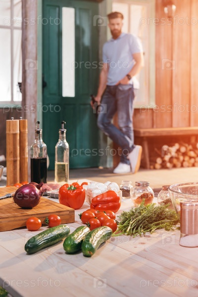 Стол с мясом и овощами для барбекю