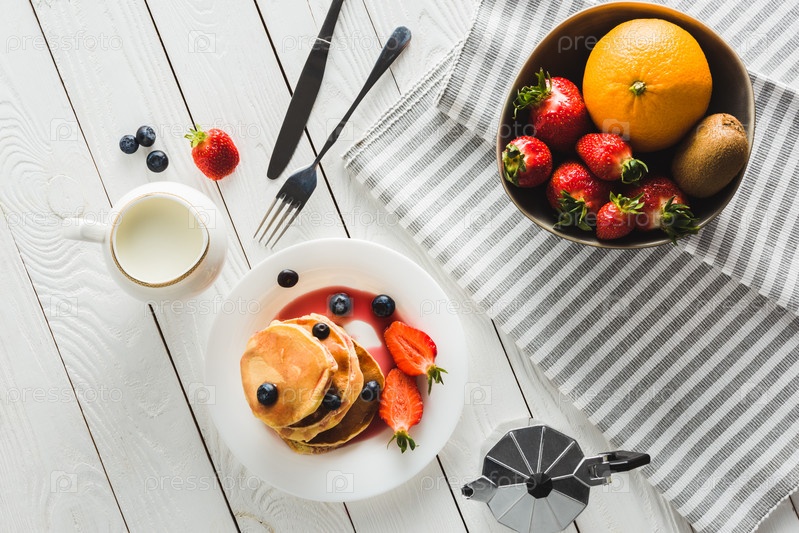 Блинчики для здорового завтрака на деревянной столешнице