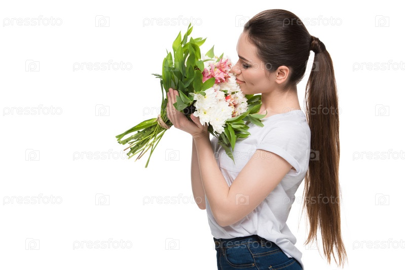 Красивая молодая женщина с букетом цветов