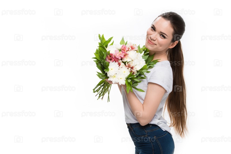Красивая молодая женщина с букетом цветов
