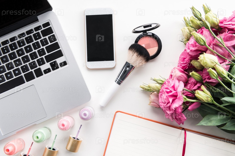 Ноутбук, смартфон, букет цветов и косметика