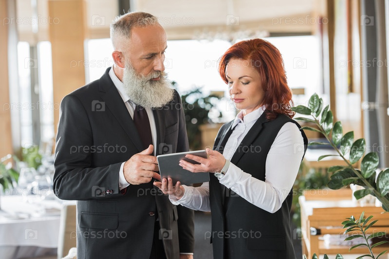 Зрелые коллеги по бизнесу с планшетом в ресторане