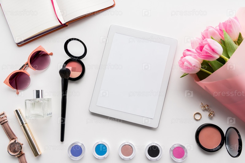 Женские аксессуары и букет розовых тюльпанов