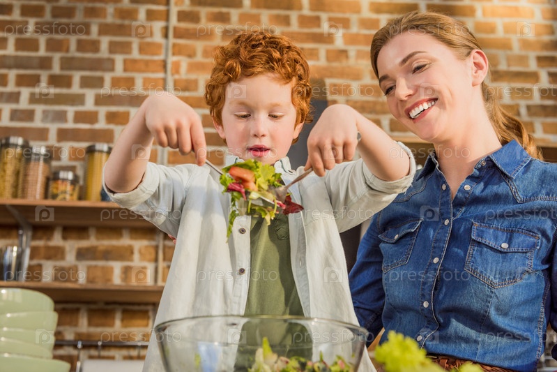 Маленький сын помогает матери готовить обед