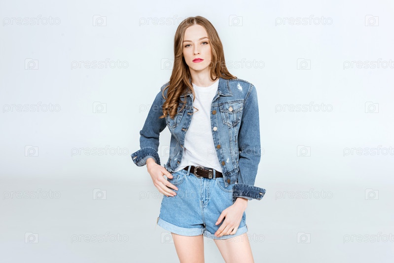 Портрет красивой молодой женщины в джинсовой куртке