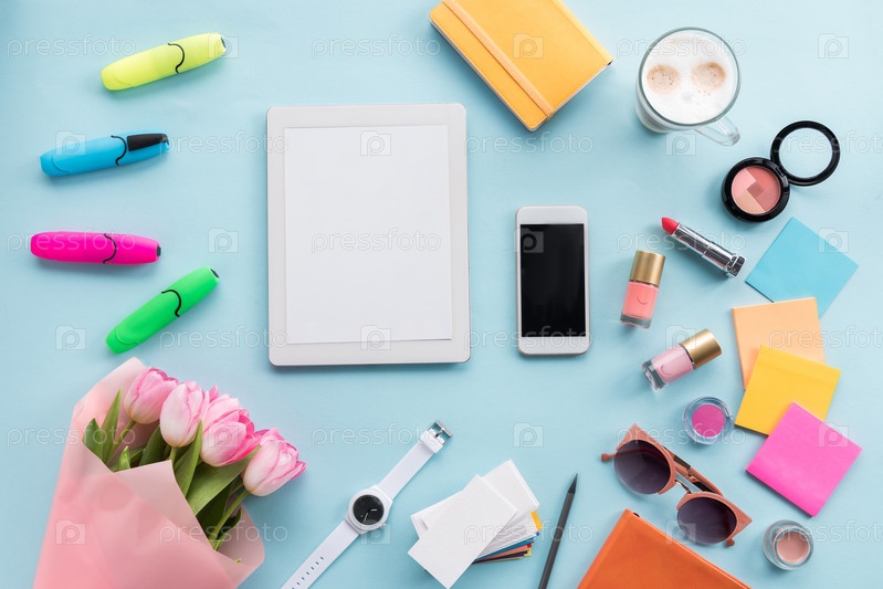 Женские аксессуары, гаджеты и букет цветов