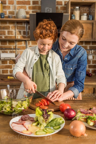 Маленький сын помогает матери готовить обед