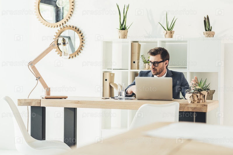 Молодой бизнесмен в костюме и очках с ноутбуком