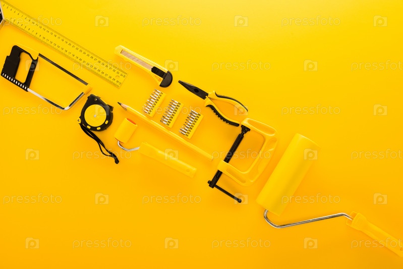 Вид сверху различных рабочих инструментов и линеек на желтом