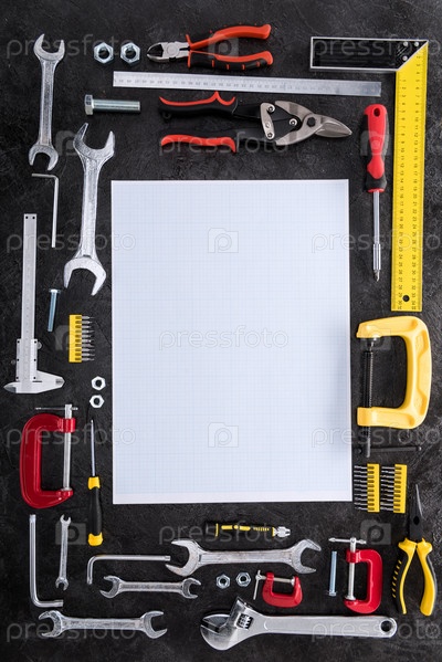 Набор рабочих инструментов и чистый лист бумаги на черном