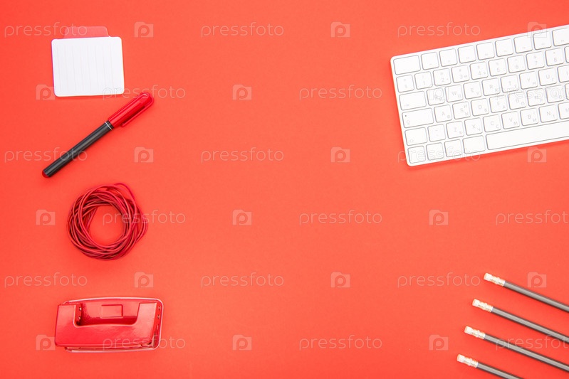 Набор офисных принадлежностей и гаджеты на красном фоне