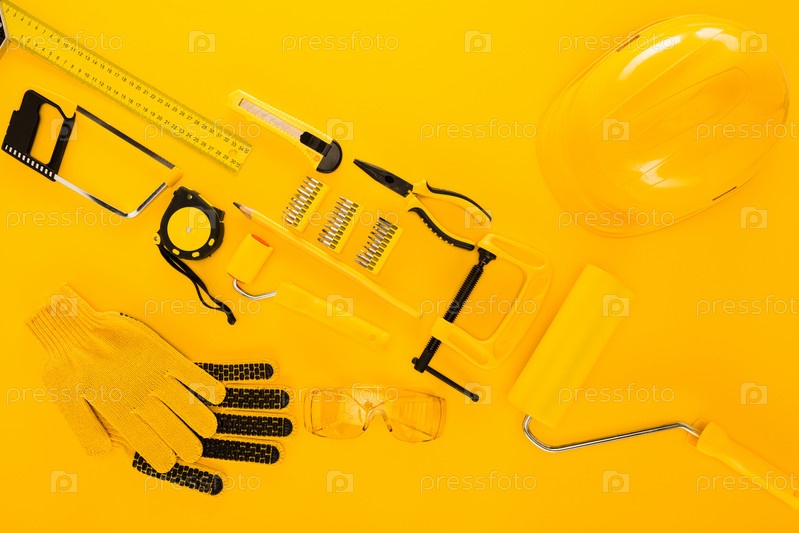 Вид сверху различных рабочих инструментов и оборудования на желтом