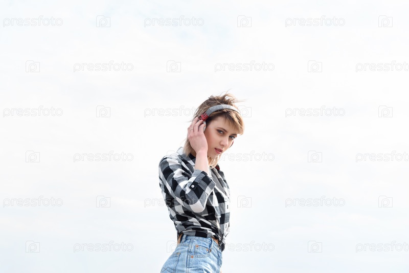 Молодая женщина в наушниках под небом