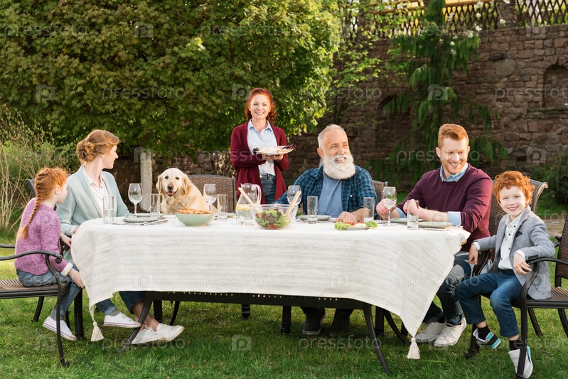 Большая счастливая семья ужинает вместе в сельской местности