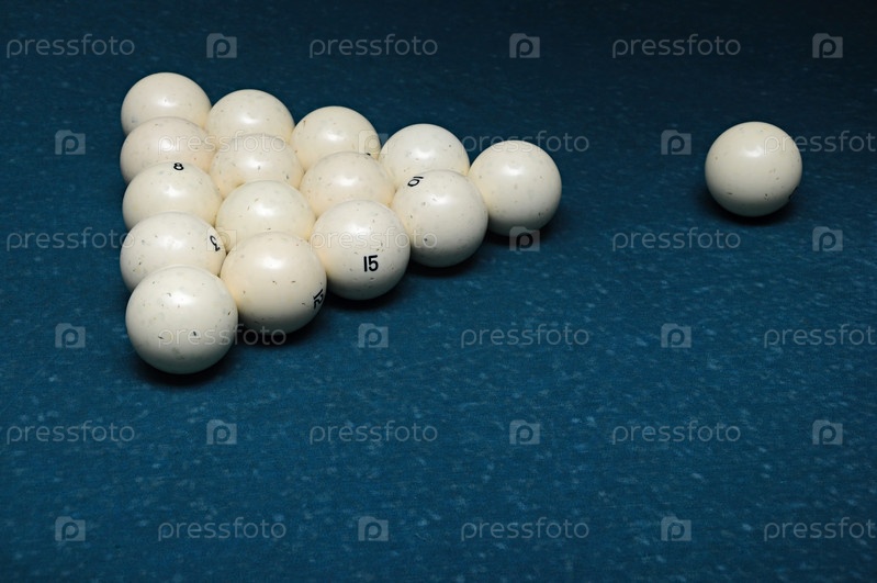Треугольник из пятнадцати бильярдных шаров и один шар отдельно на синем столе