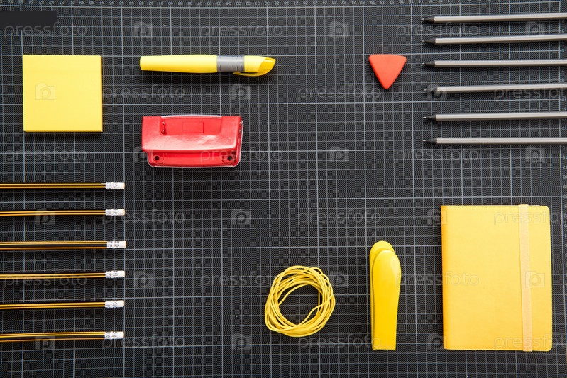 Набор различных канцтоваров на черном фоне