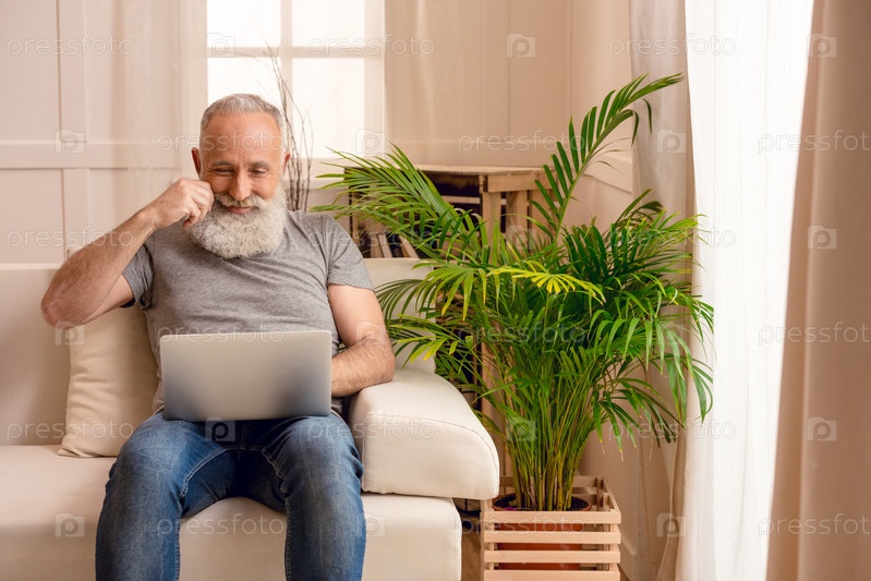 Веселый мужчина на диване у себя дома