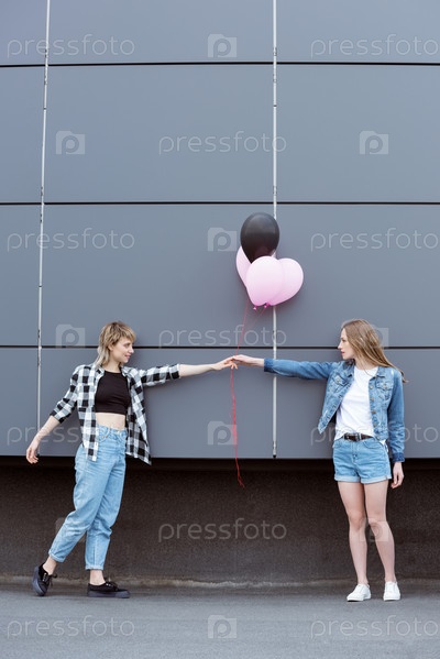 Портрет лесбийской пары с воздушными шарами на открытом воздухе