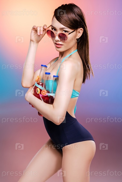 Привлекательная молодая женщина в купальнике с напитками