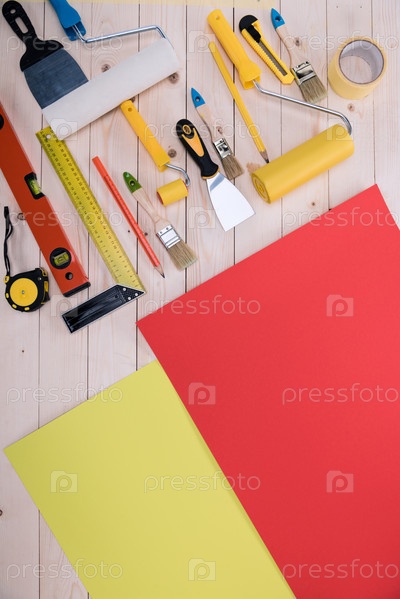 Набор строительных инструментов и цветная бумага на деревянном столе