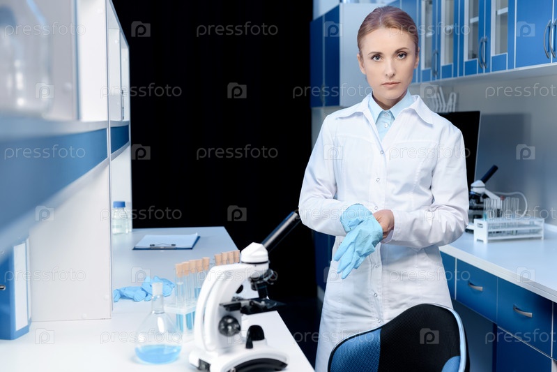 Ученый надевает защитные перчатки в лаборатории