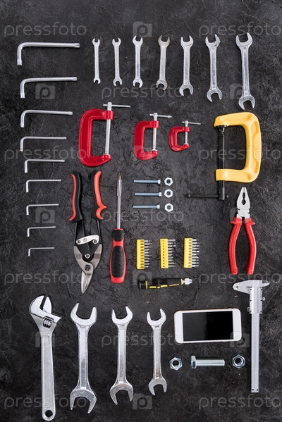 Набор всевозможных инструментов работы на сером