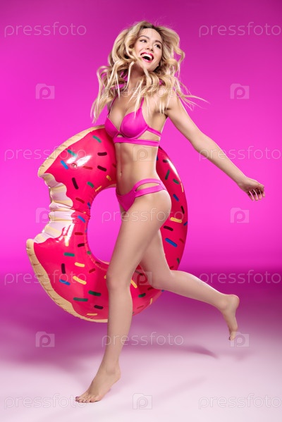 Красивая молодая женщина в бикини с плавательным кругом в форме пончика