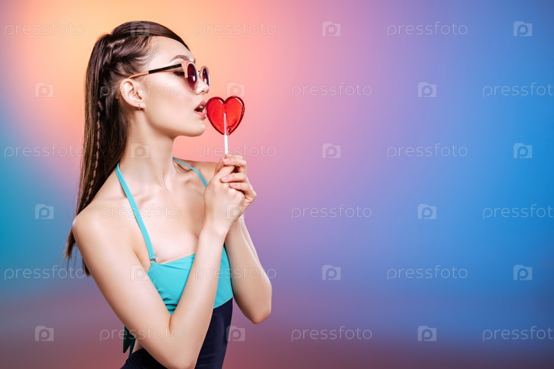 Чувственная молодая женщина в темных очках с леденцом