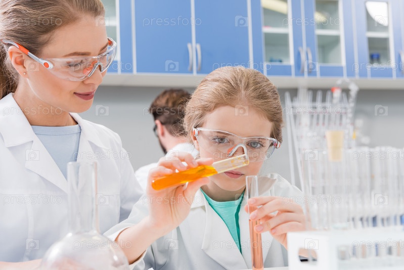 Взрослый ученый и девочка в лаборатории