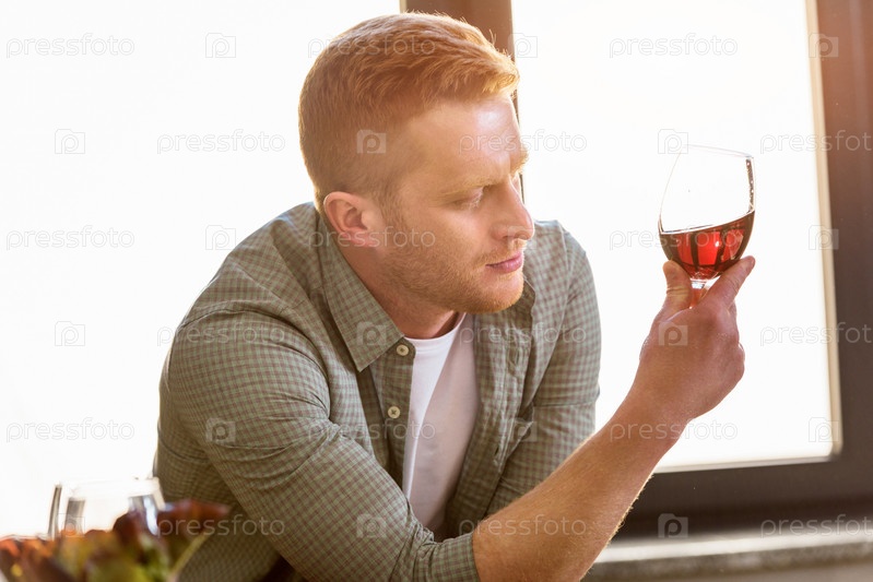 Задумчивый человек, глядя на бокал вина в руке