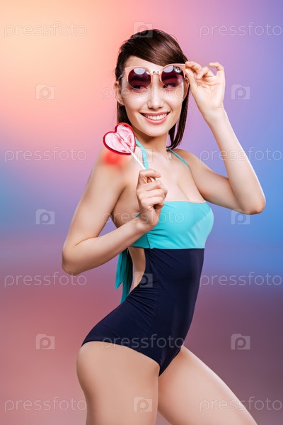 Привлекательная молодая женщина в купальнике с леденцом