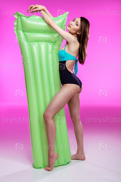 Красивая молодая женщина в купальнике с надувным матрасом