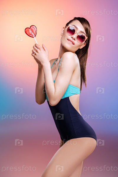 Красивая молодая женщина в темных очках с леденцом