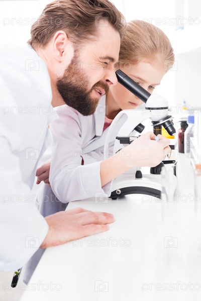 Учитель и ученик работающие с микроскопом в лаборатории